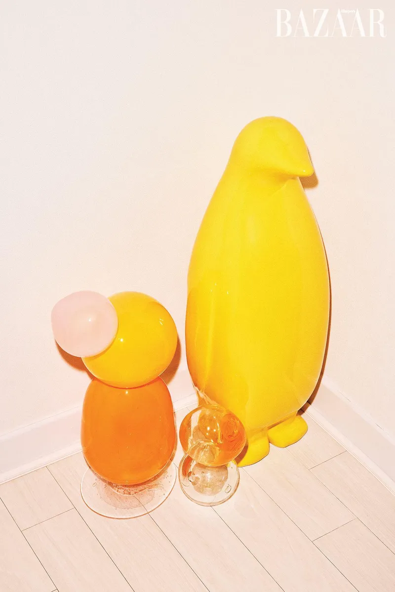 비단 집만이 아니었다. 건조한 성격이었던 포토그래퍼 남편과 유리처럼 맑고 밝은 공예가 아내의 만남은 서로를 변화시켰다. “처음 제 짐을 들고 왔을 때 남편이 왜 이렇게 물건이 많냐고 핀잔을 주더라구요. 그래서 이건 30년의 내 인생을 들고 온 거라고 했죠. 현관에 있는 파란 거울은 처음으로 제 작품을 팔아서 생긴 수입으로 산 거울이고, 거실에 걸린 고래 모빌은 저와 남편을 이어준 작품이고, 거실 소파 위에 달린 동그란 유리 구슬 장식품은 저희가 결혼하면서 함께 구입한 장-미셸 오토니엘의 판화(바로 옆에 걸려 있는 그 작품!)를 오마주한 거에요.” 부부의 집은 한 여자의 인생과 한 남자의 인생이 합쳐지고, 또 그 둘이 새롭게 써 내려가는 시간이 곳곳에 박제되어 있었다.